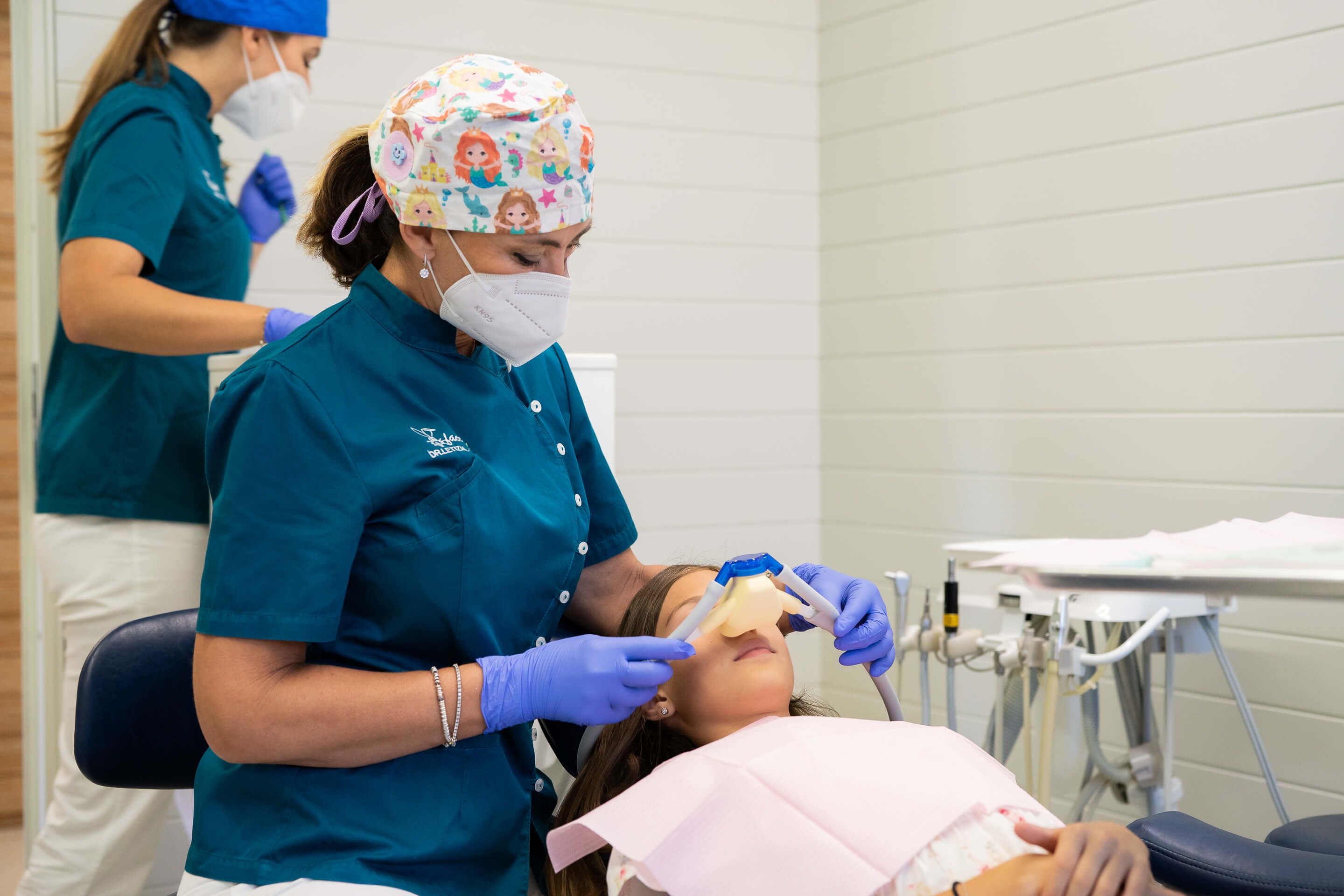 La sedazione cosciente con ossigeno e protossido d'azoto trova la sua applicazione ideale proprio nell'odontoiatria pediatrica, in particolare per quei bambini molto piccoli o traumatizzati da una precedente esperienza odontoiatrica. Si utilizza un apparecchio (sedation machine) in grado di miscelare due gas, ossigeno e protossido d'azoto, in percentuali ben definite; la miscela viene inalata dal bambino tramite una mascherina profumata in modo da raggiungere uno stato di sedazione.